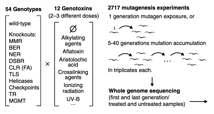 As mentioned by Douglas Hanahan in the “cancer hallmark paper (2022) (version 1: 2011)”, genome (DNA) instability and mutation is a fundamental component of cancer formation and pathogenesis. In the laset two decades, computational analysis of pan-cancer data has identified signatures of mutational processes thought to be responsible for the pattern of mutations in any given cancer. These analyses identified altered DNA repair pathways in a much broader spectrum of cancers than previously appreciated with significant therapeutic implications. The development of DNA repair deficiency biomarkers is critical to the implementation of therapeutic targeting of repair-deficient tumors, using either DNA damaging agents or immunotherapy for the personalization of cancer therapy (Jennifer Ma, et al. 2018). But the underly causal factor behind this process is hard to quantify in human, so as an alternative option, experiments have been done in model organisms, such as worm.