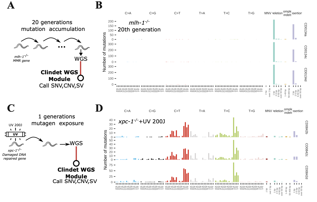 In the original paper, 54 gentypes C.elegans were treated by 12 genotoxins with 2-3 different doses, generated 2717 total mutagenesis experiments and whole genome sequencing data. We utilized Clindet’s tumor-normal paired mode within the WGS module to analyze this dataset and successfully reproduced the mutational signatures reported in the original study. Our focus was on WGS data from seven mutant worm samples and their matched normal controls, including: (1) three biological replicates of mlh-1 mutants, deficient in DNA mismatch repair and propagated for 20 generations; (2) three replicates of xpc-1 mutants exposed to UV light; and (3) one mrt-2 mutant, deficient in telomere maintenance and also propagated for 20 generations, which is known to undergo telomere crisis and breakage-fusion-bridge (BFB) cycles, resulting in extensive copy number alterations and genomic rearrangements.