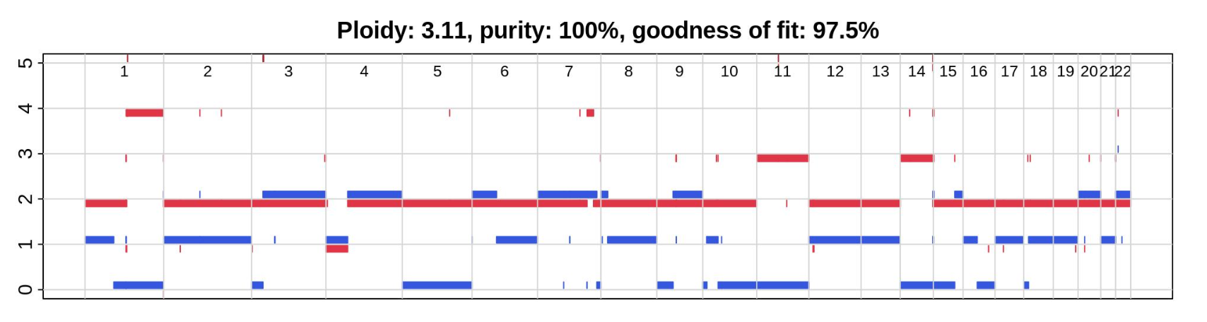 To assess the consistency among different software tools in representing the genomic content of the COLO829 cancer cell line, we evaluated the presence of CNVs and SVs. Regarding copy number variation, the four software tools generated similar estimates of tumor purity and ploidy.