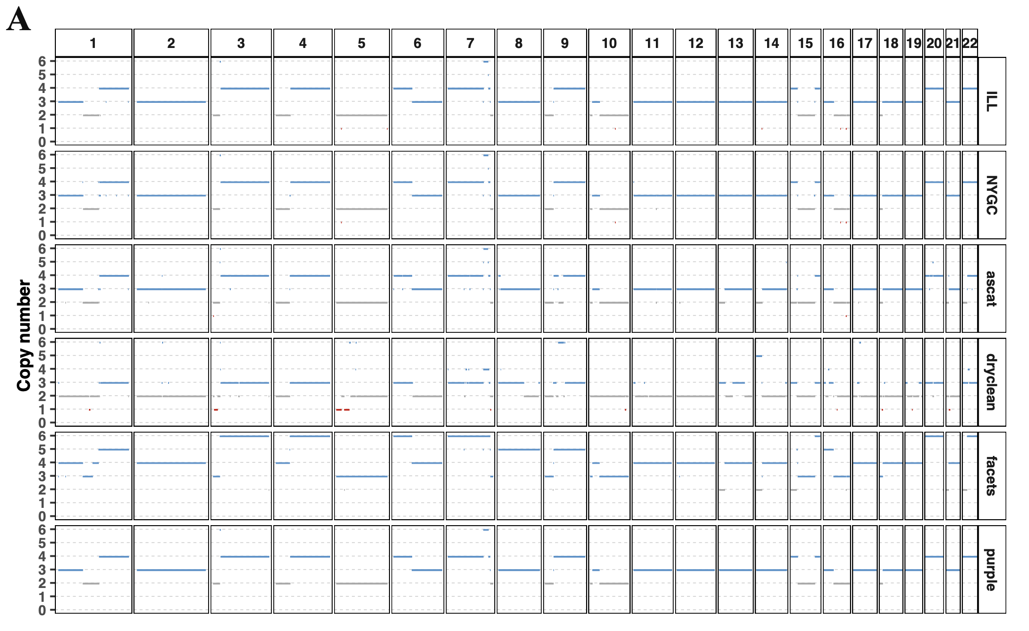 Furthermore, low-resolution copy number alteration (CNA) analysis revealed highly consistent copy number profiles across external “true set” software tools except for Facets, with correlation coefficients of 0.76–0.98 among different datasets.
